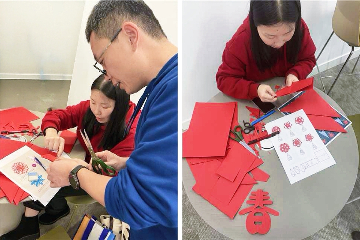 與此同時,另一張長桌上鋪開了紅紙和剪刀。民俗老師正耐心示范中國剪紙的技法。西班牙同事也紛紛坐下,學著折疊、勾畫、裁剪。不一會兒,一張張紅紙變成形態各異的“春”字——這個象征新生與希望的漢字,第一次在他們手中“活”了過來。